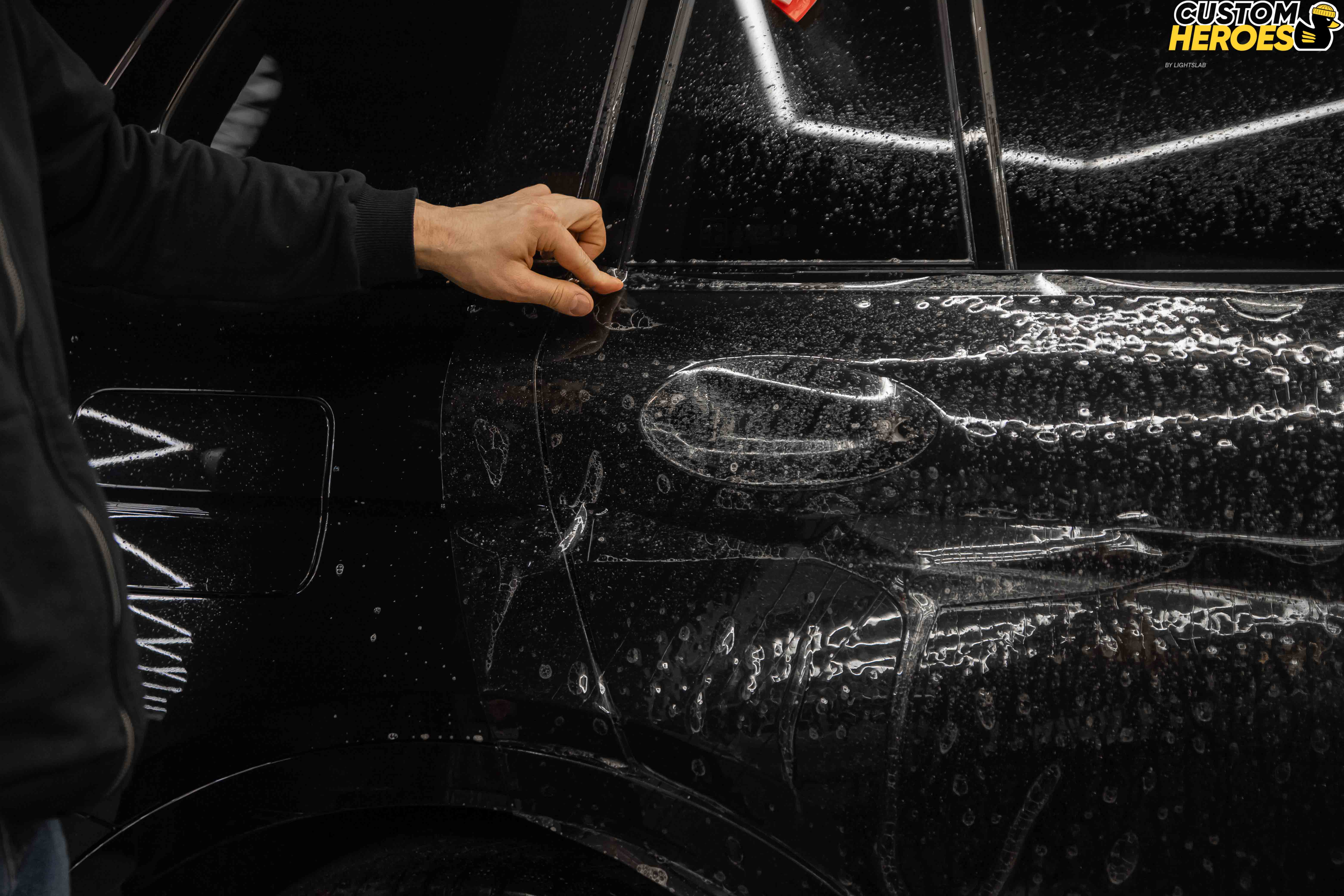 - Переклеивание задней правой двери. По просьбе клиента подготовили кусок плёнки в тон и аккуратно наклеили заново — вся поверхность максимально ровная и без отличий по цвету или оттенкам.