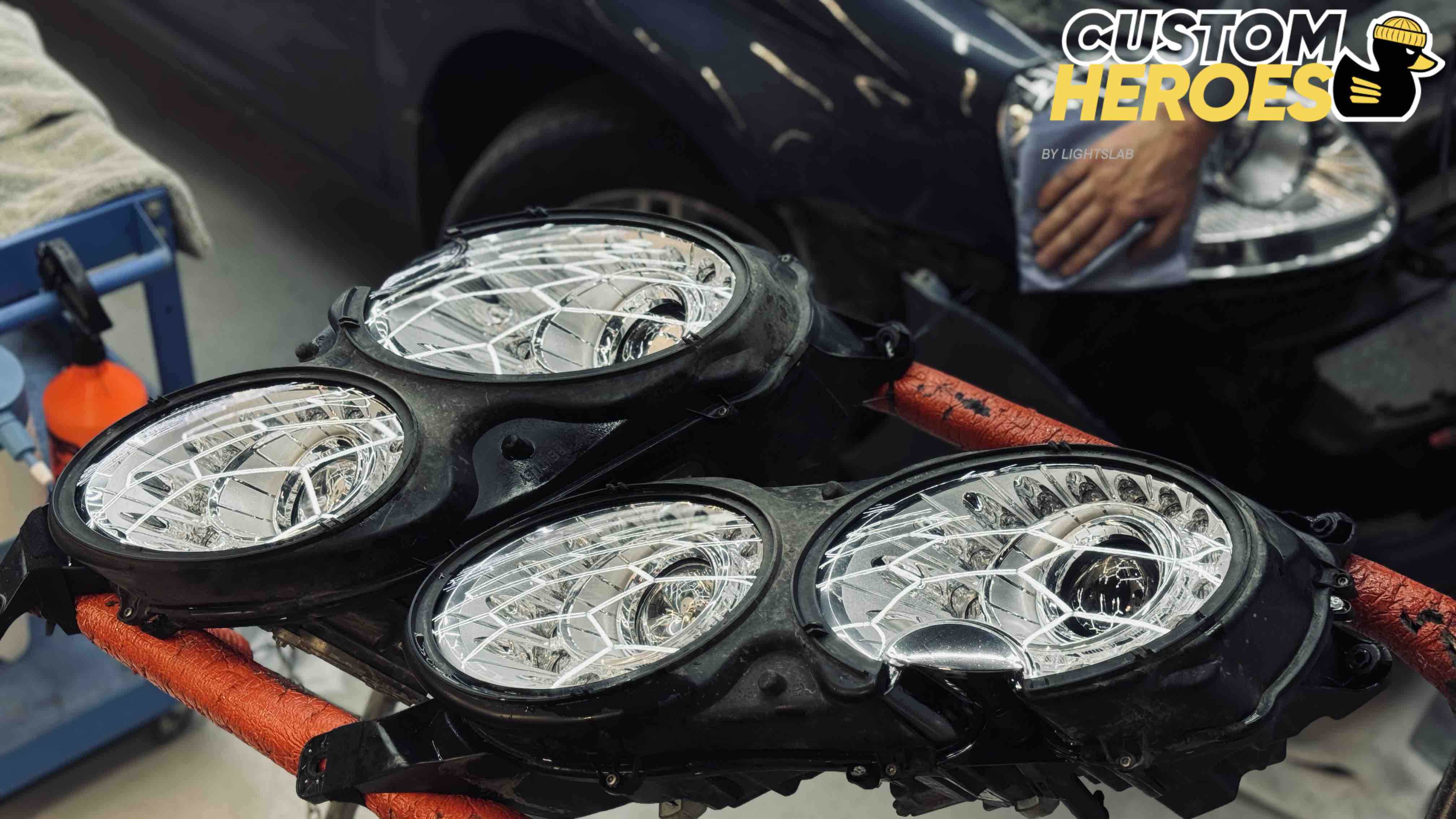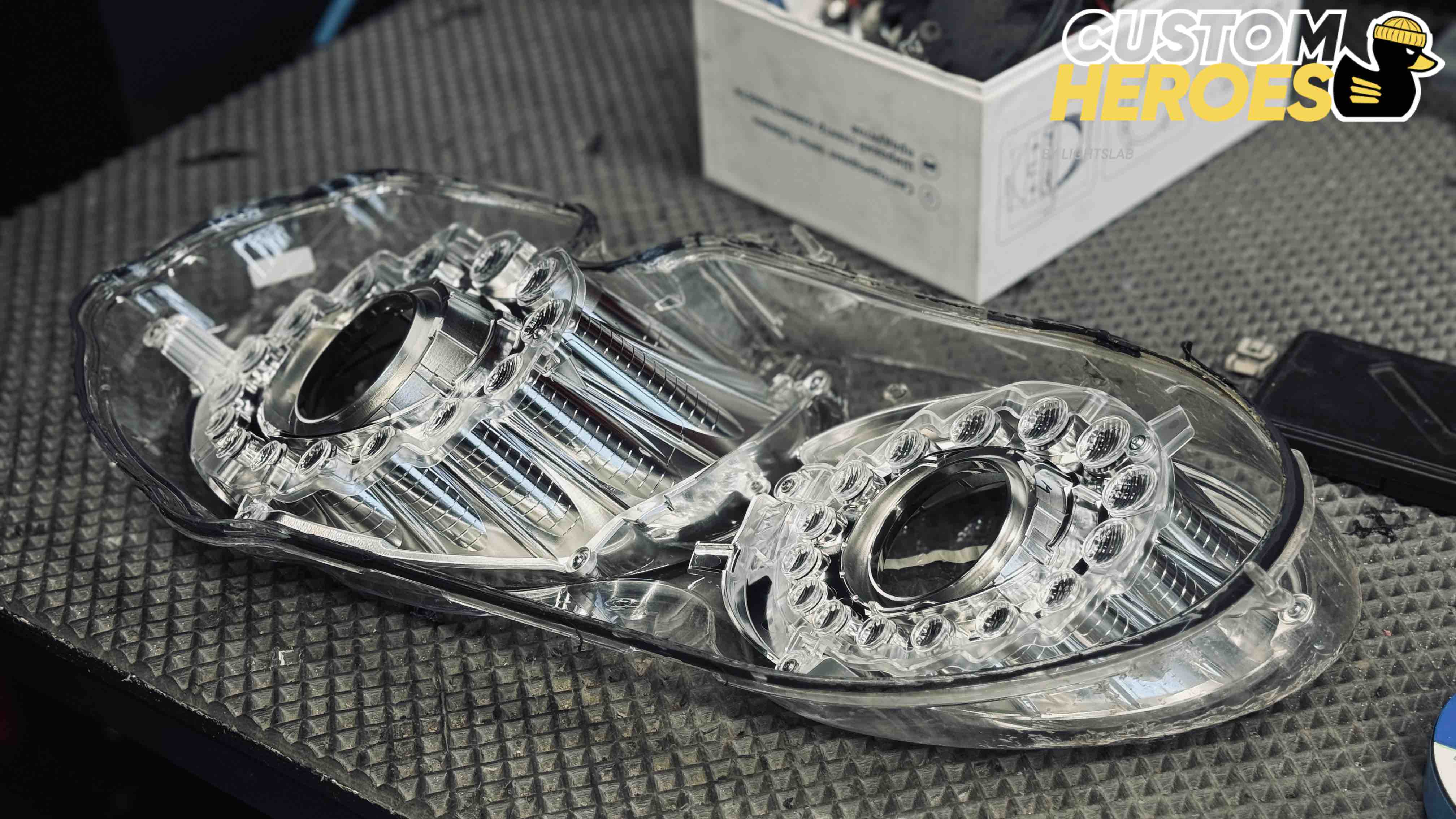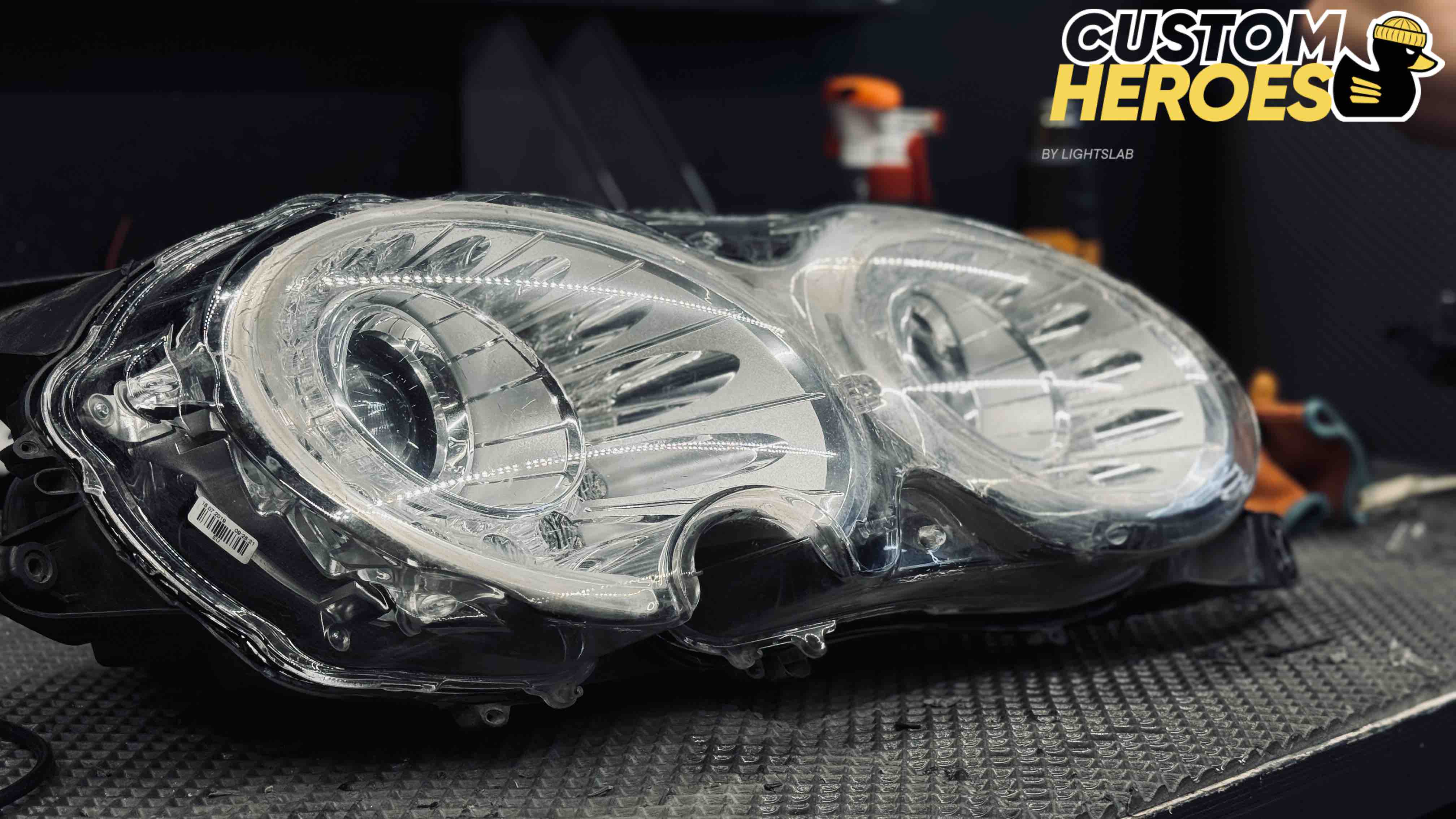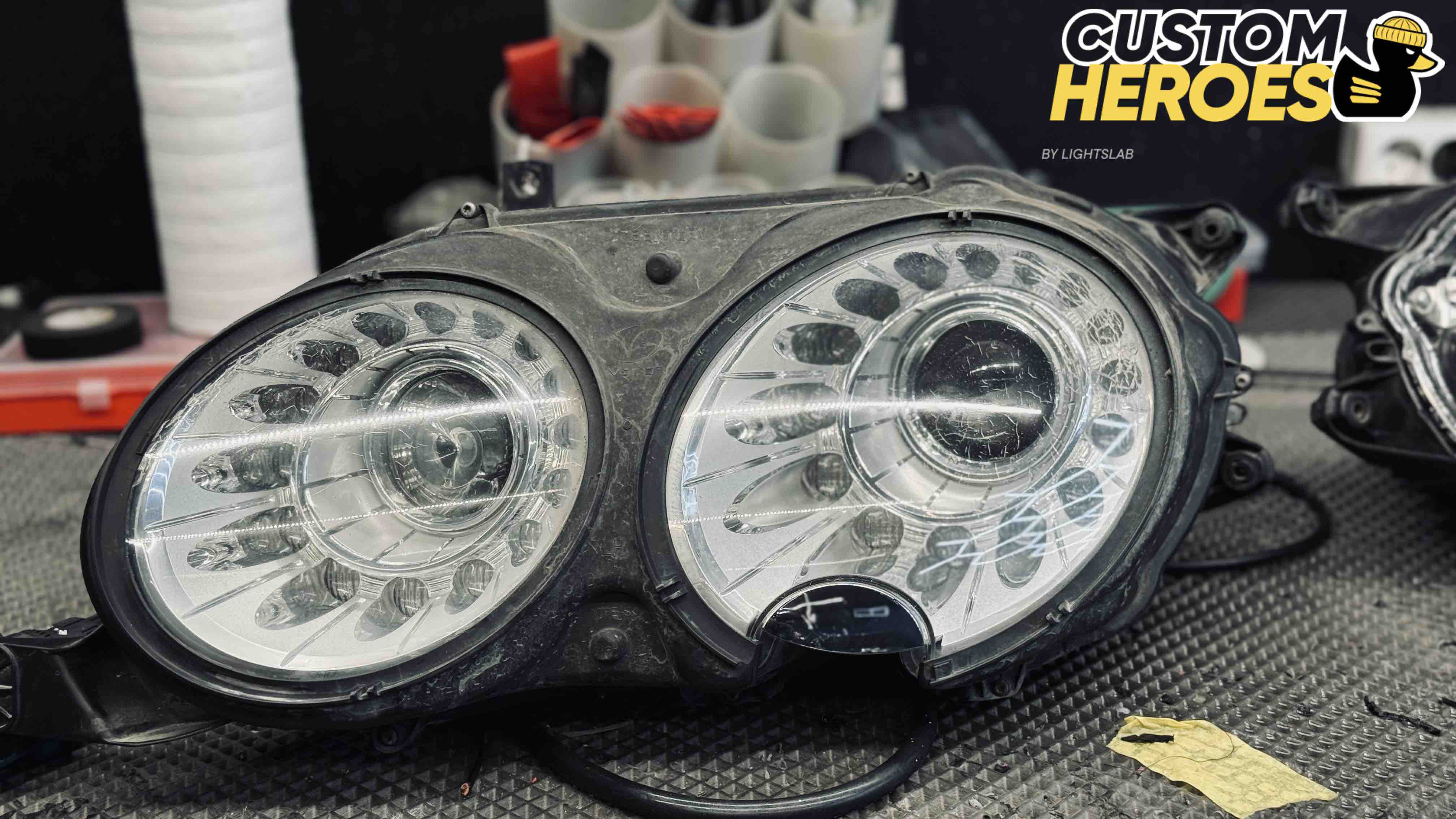 В студию Custom Heroes обратился клиент с передними фарами от роскошного Bentley. Несмотря на престиж и качество этого автомобиля, даже на таких моделях со временем появляются дефекты оптики — стекла мутнеют, покрываются микротрещинами и песочной эрозией от дорожных реагентов и камней. В данном случае стекла были не только запесочены, но и имели явные трещины, из-за чего фары потеряли прозрачность и привлекательный внешний вид.