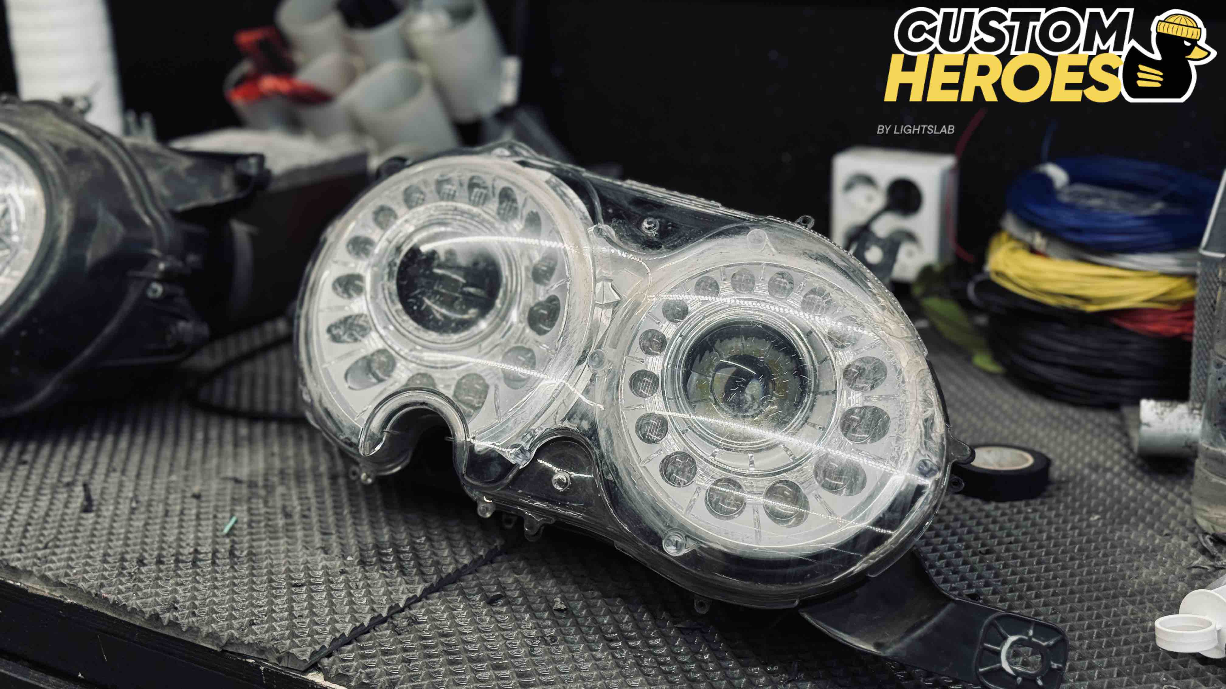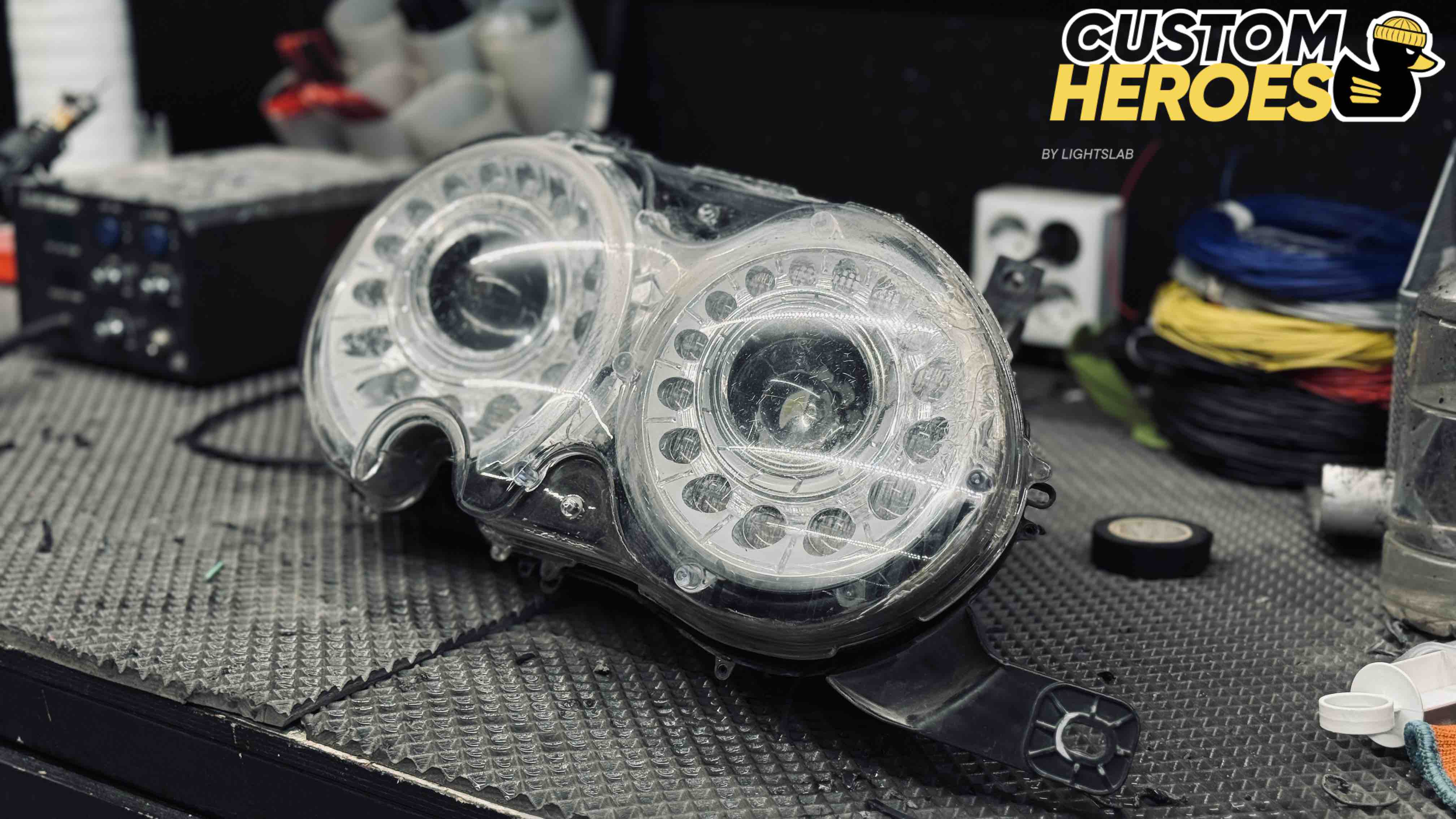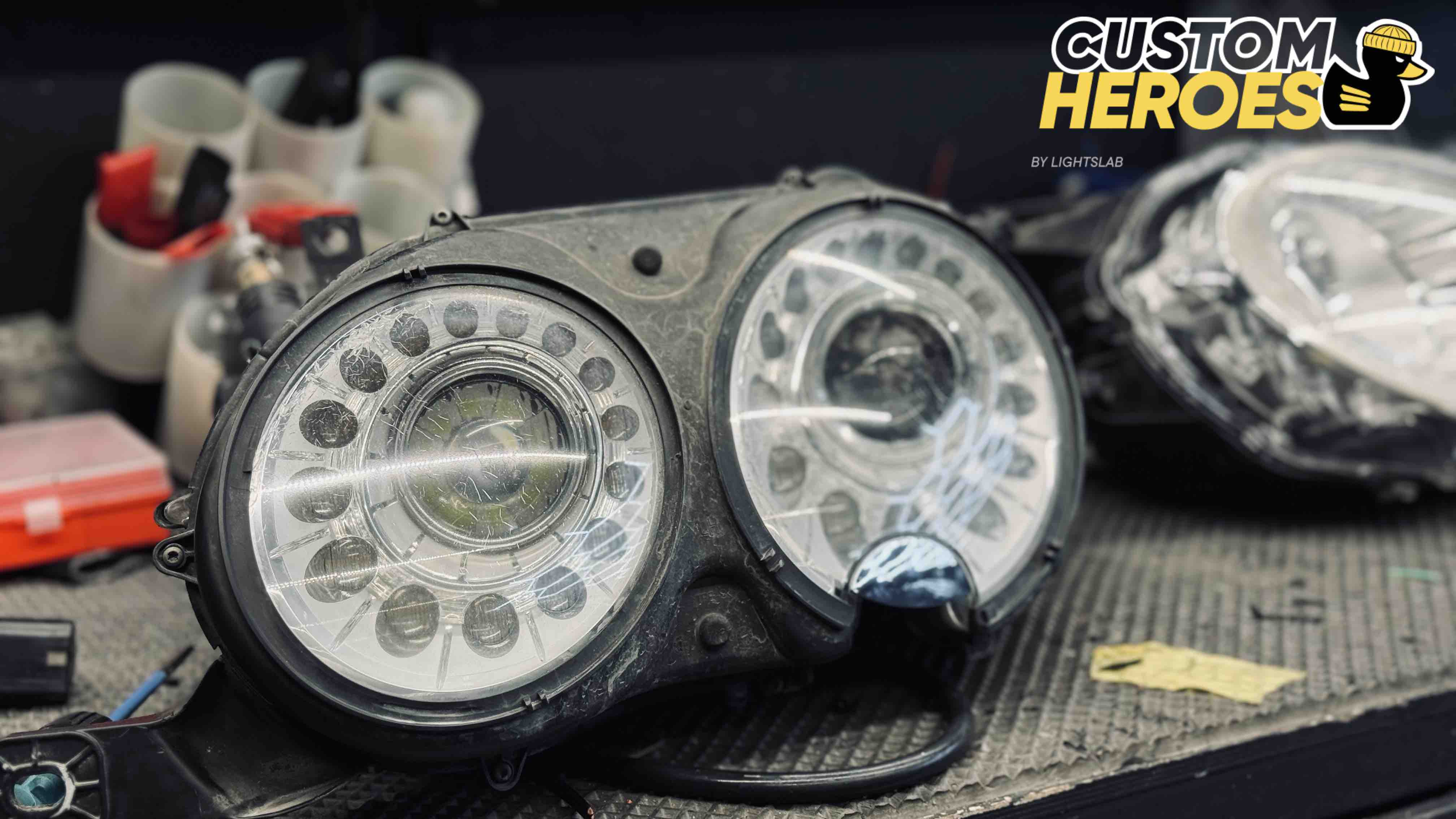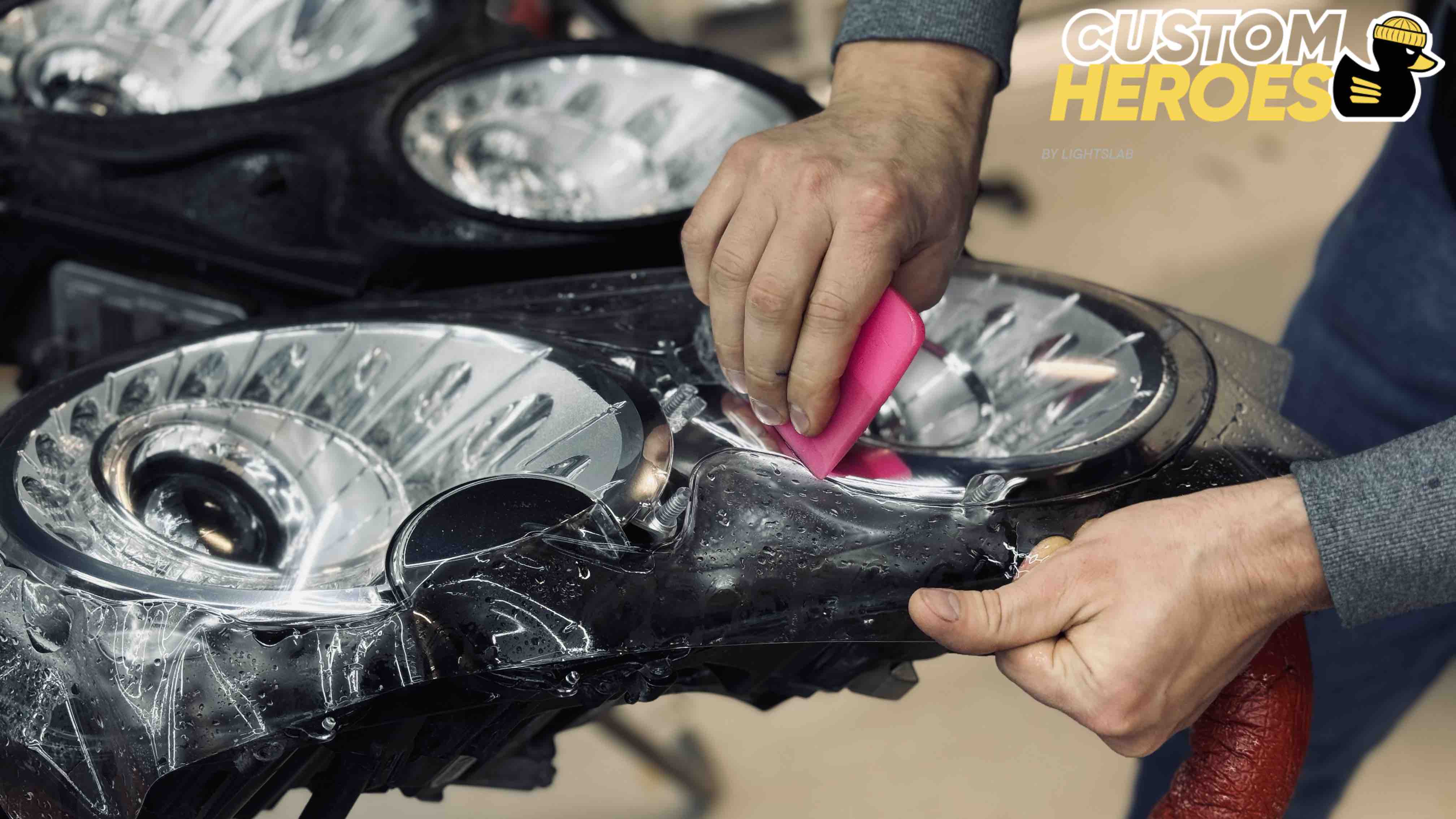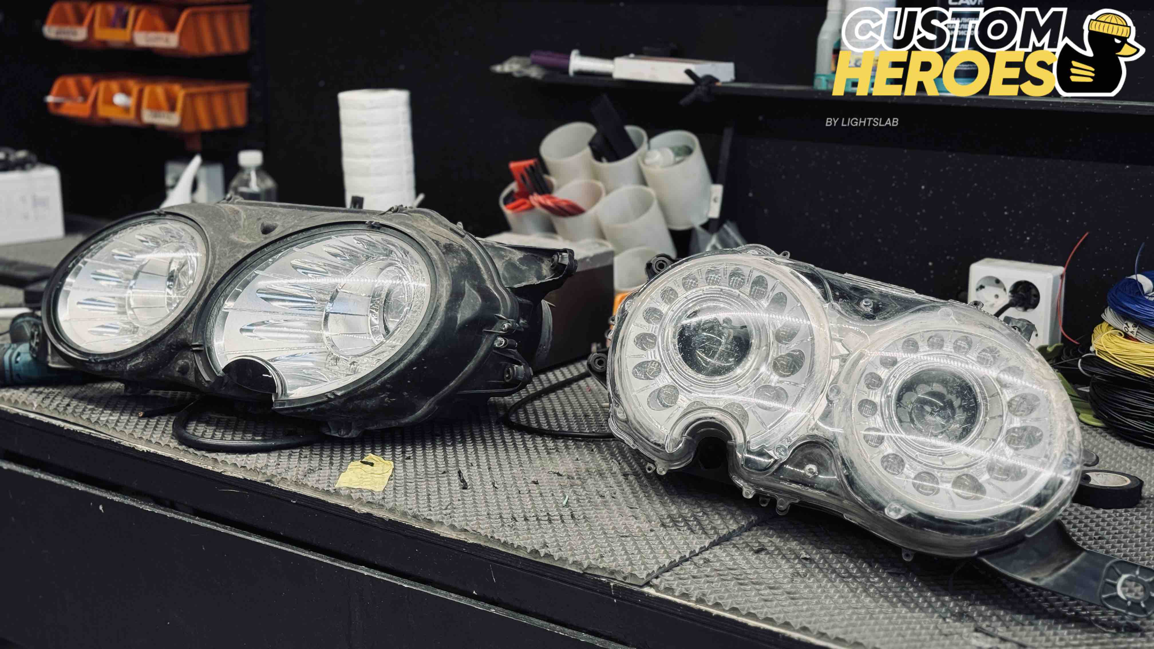 В студию Custom Heroes обратился клиент с передними фарами от роскошного Bentley. Несмотря на престиж и качество этого автомобиля, даже на таких моделях со временем появляются дефекты оптики — стекла мутнеют, покрываются микротрещинами и песочной эрозией от дорожных реагентов и камней. В данном случае стекла были не только запесочены, но и имели явные трещины, из-за чего фары потеряли прозрачность и привлекательный внешний вид.