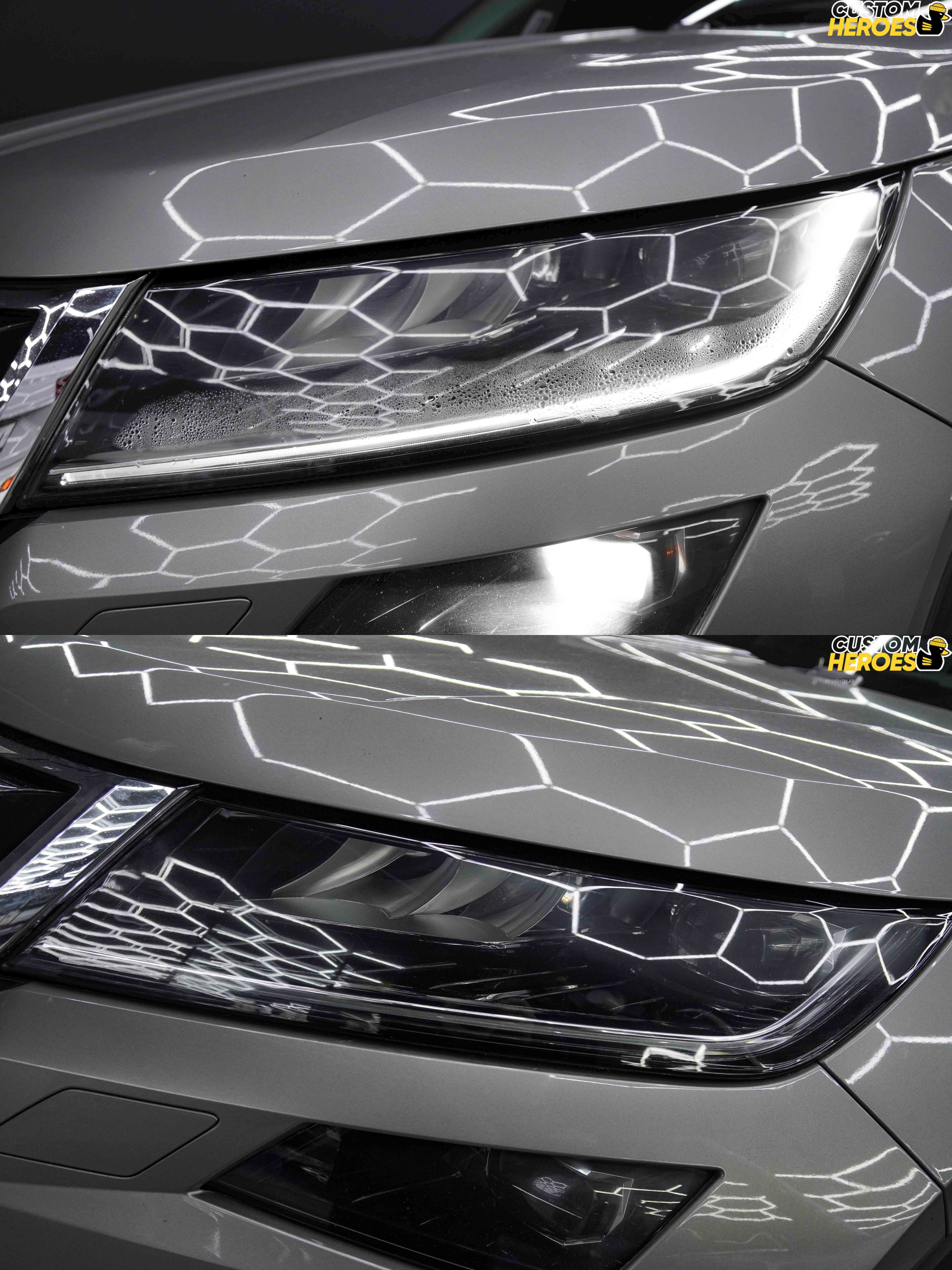 Во время диагностики специалисты Custom Heroes обнаружили частичное нарушение герметичности по нижнему шву корпуса, а также загрязнение вентиляционных каналов. Из-за большой конструкции фары (характерной для Skoda Kodiaq) работа требовала повышенной аккуратности и времени — разбор крупной оптики сложен и требует профессионального оборудования.