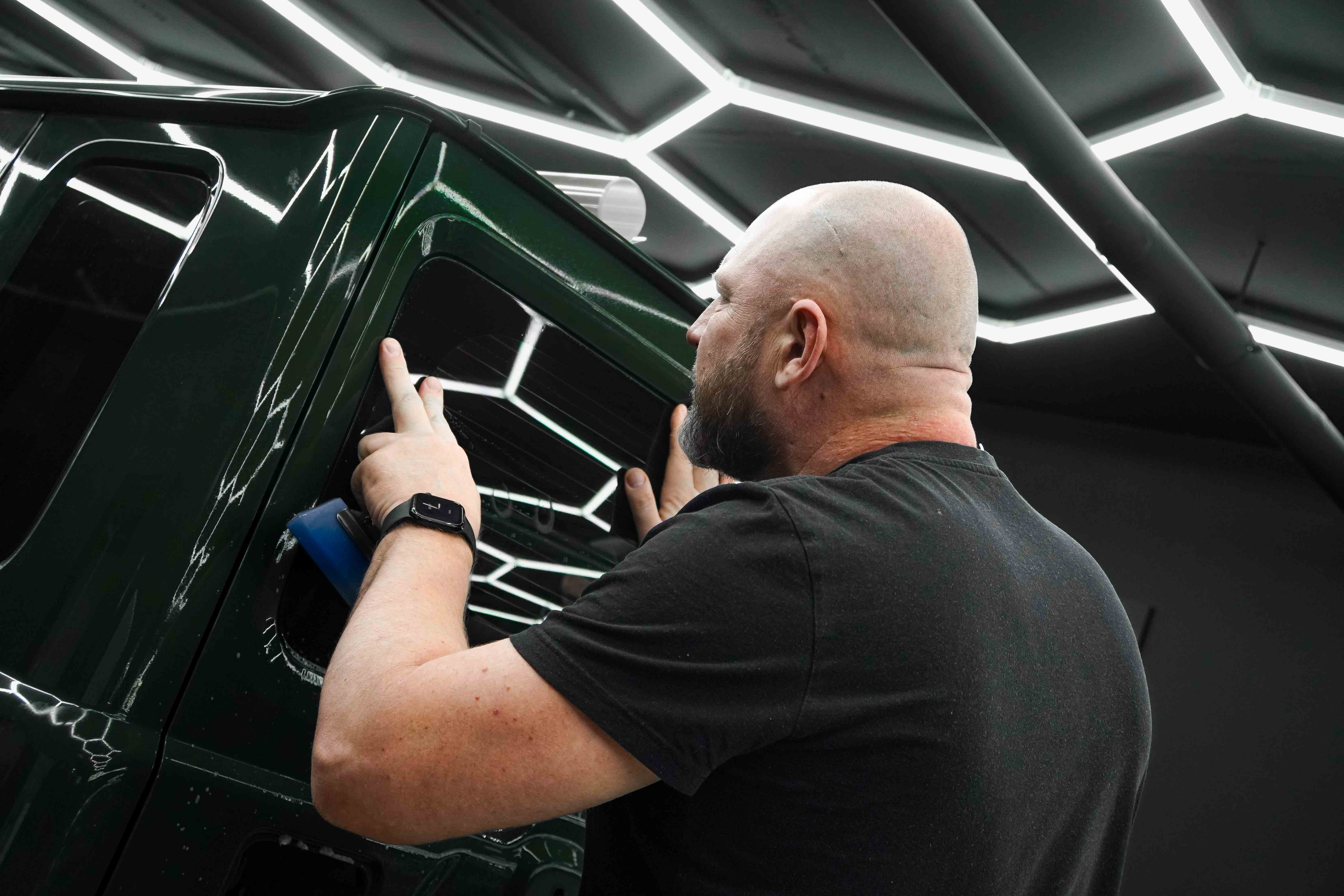 Вторым этапом была выполнена оклейка лобового и заднего стекла в инновационную плёнку Quantum Antiskol TPU.