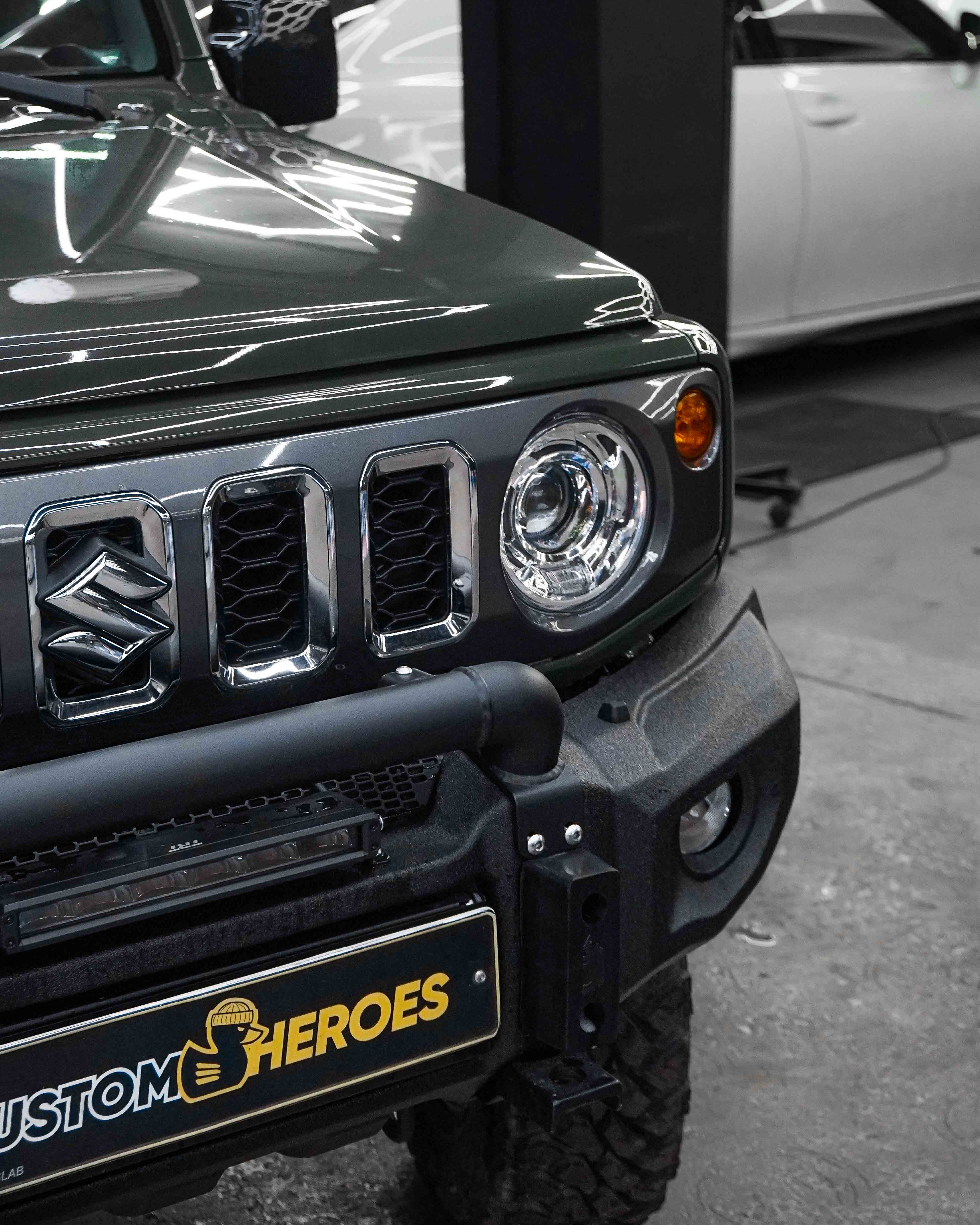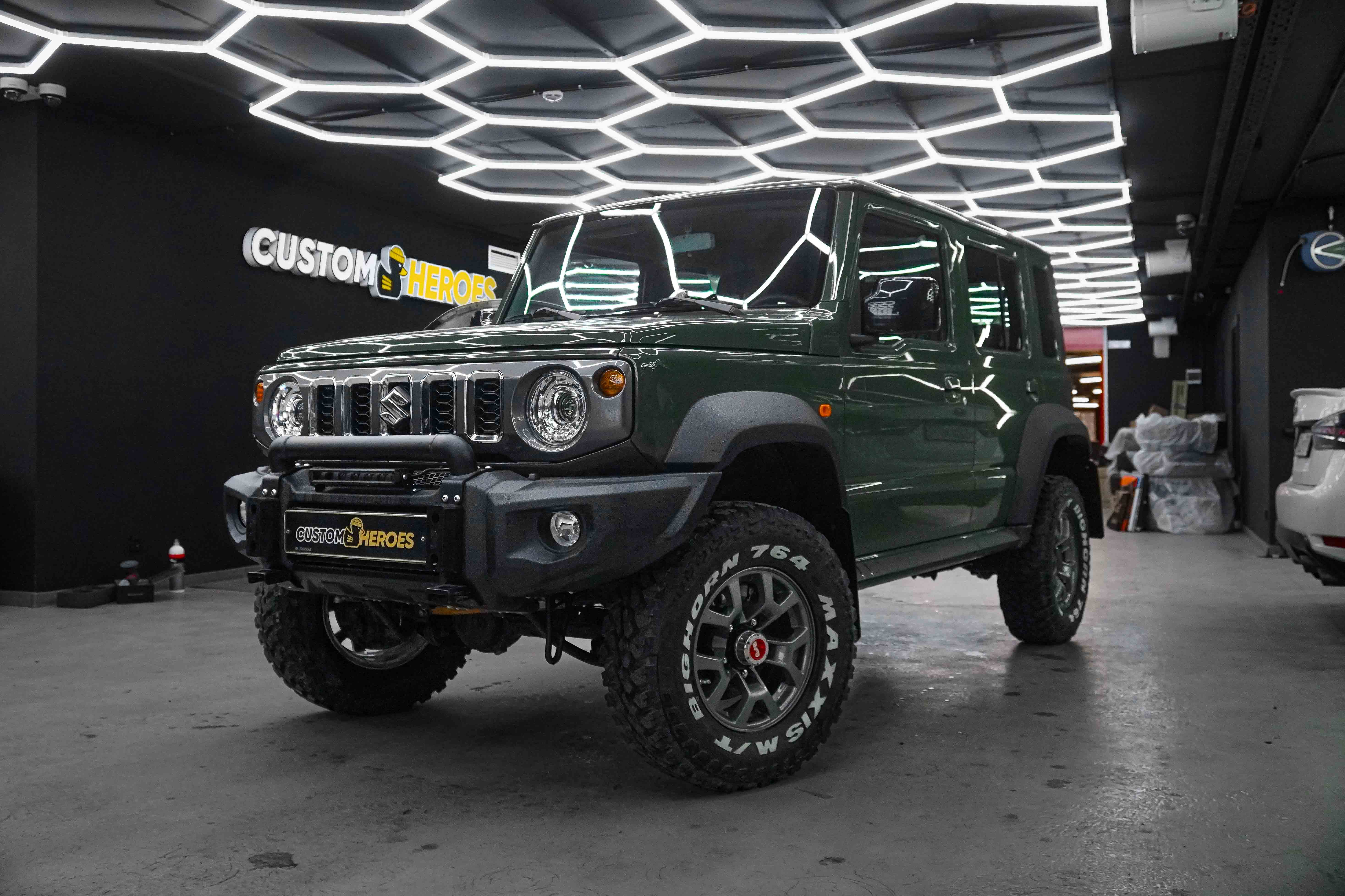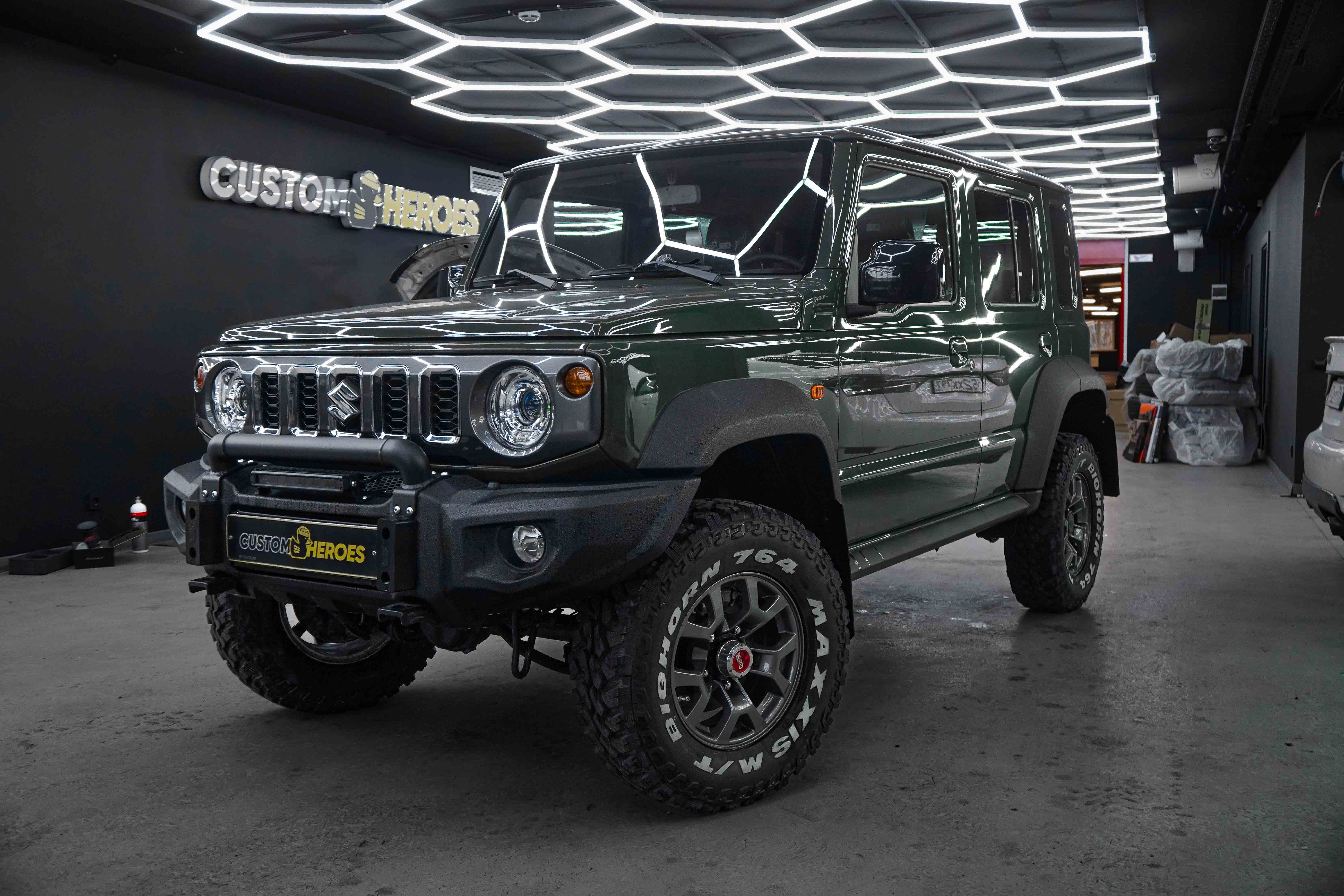 В стенах студии Custom Heroes появился довольно редкий автомобиль на наших дорогах, но при этом культовый среди любителей офф-роуда и трофи-рейдов — Suzuki Jimny. И редкость его не только в характере, а в исполнении: перед нами пятидверный Jimny в эксклюзивном цвете Military, пригнанный из ОАЭ нашим постоянным клиентом.