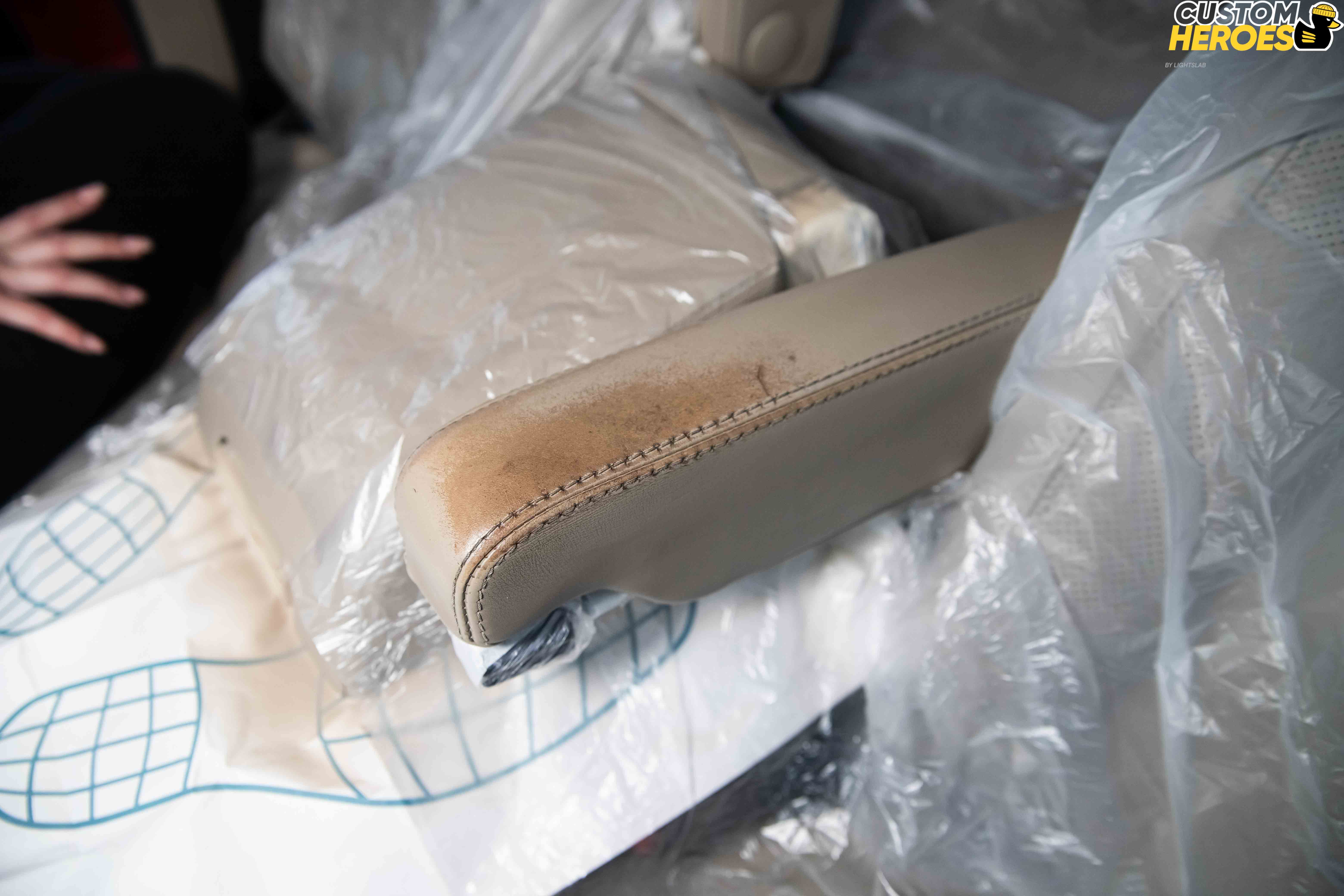 Осмотр показал, что основной износ — кожа, особенно на сиденьях и дверных картах. Потёртости и складки — результат длительной эксплуатации и городского ритма жизни. Внутреннее состояние — контролируемое, никаких признаков сильного загрязнения, но кожа требует восстановления. Было решено начать с глубокой химчистки для полной очистки поверхности и устранения запахов, а дальше — фокус на коже.