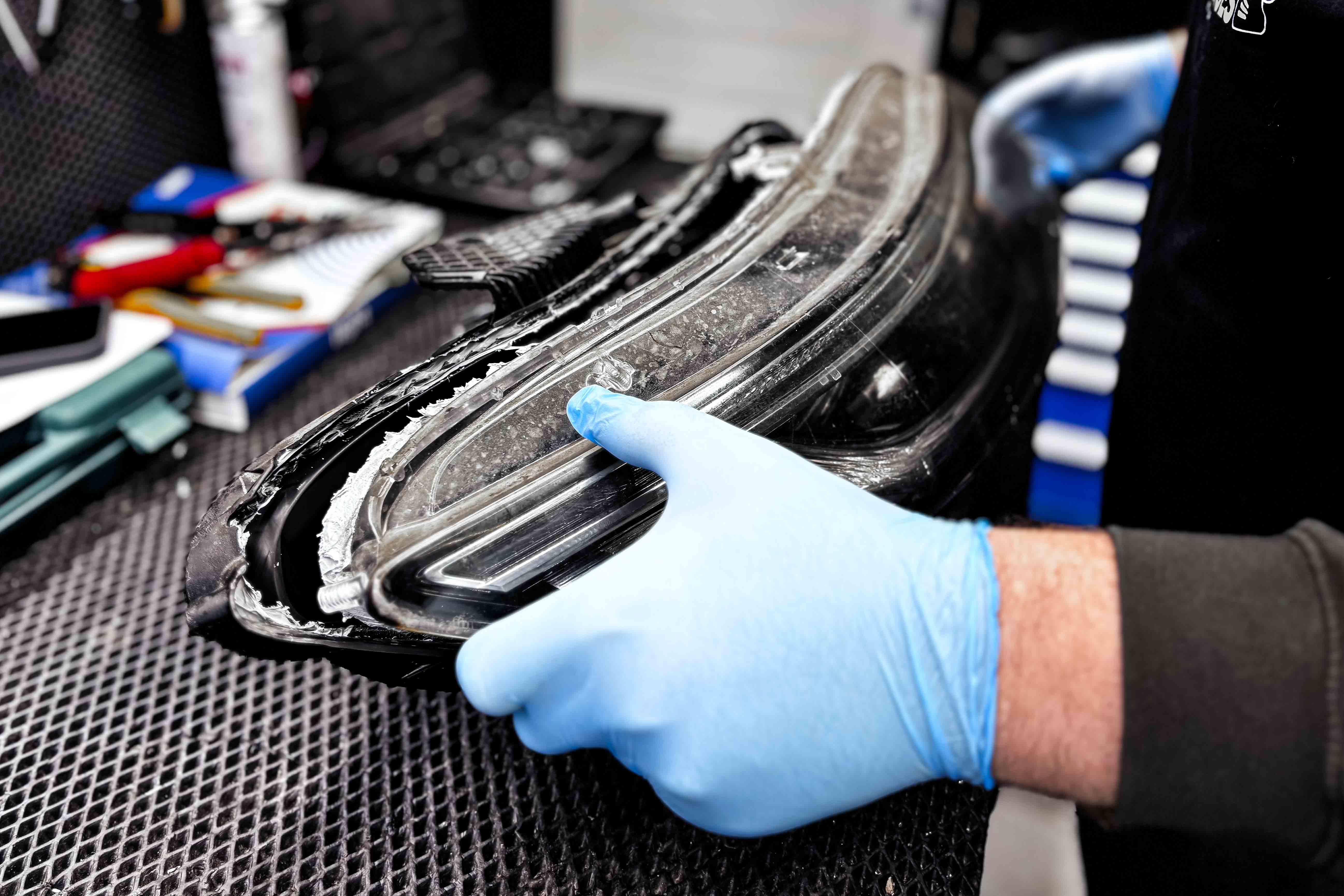 При осмотре специалисты Custom Heroes выявили поверхностные царапины, следы пескоструя и окисленный защитный слой пластика. Такие дефекты не только ухудшают внешний вид, но и значительно снижают светопропускание, особенно в тёмное время суток и при плохой погоде.