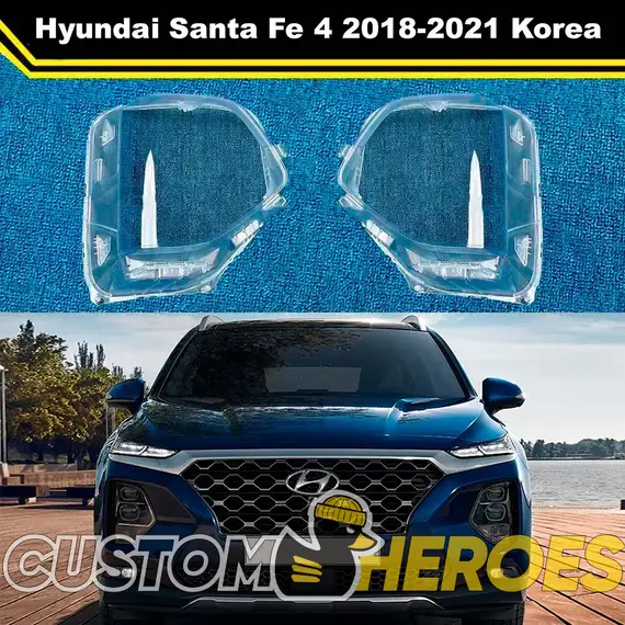 Высококачественные стекла фар из оптического поликарбоната с защитным УФ-лаком идеально подходят для замены оригинальных стекол фар на Hyundai Santa Fe 2018-2021 TM IV