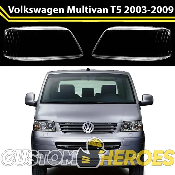 Высококачественные стекла фар из оптического поликарбоната с защитным УФ-лаком идеально подходят для замены оригинальных стекол фар на Volkswagen Multivan 2003-2009 T5